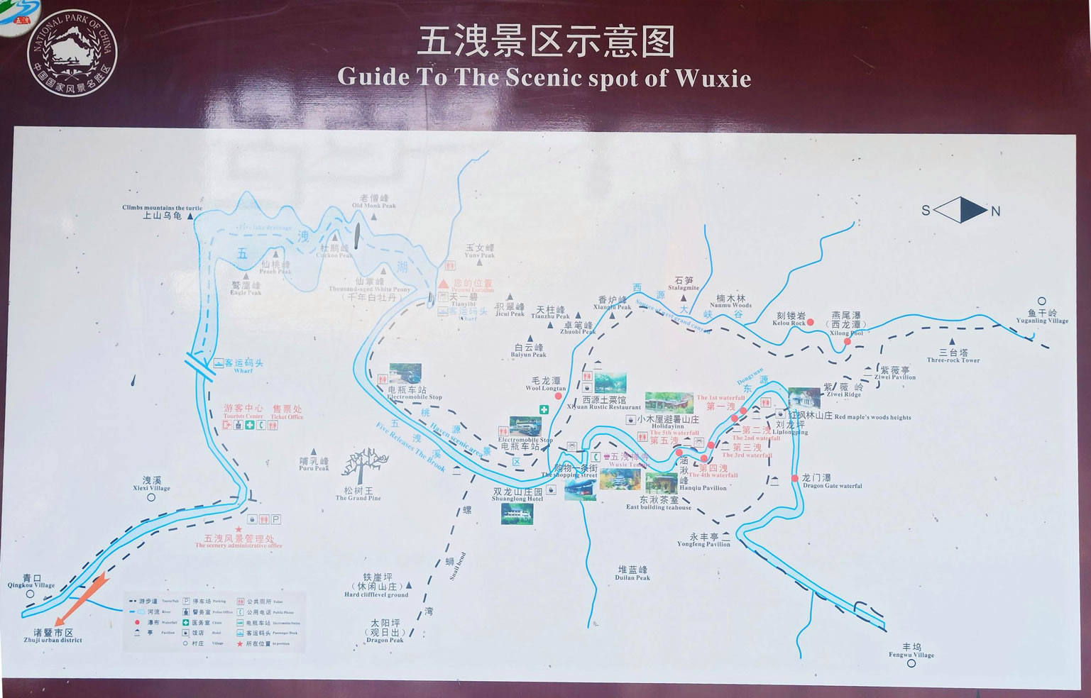 由紫藤長廊拾階登上壩頂,眼前展現(xiàn)的是一湖靜水,綠水蕩漾,深不可測。 水面上疾駛的游船,不時激起層層漣漪,把兩岸的元寶峰,鷲鷹峰,仙桃峰、杜鵑峰、老僧峰、仙掌峰等山峰的倒影彎折。 泛舟湖上,水鳥在水面低飛,狹長的湖面見不到盡頭,大有“青山綠水景無盡”之感,又有“一折青山一扇屏,一彎綠水一古琴”的詩意。沿湖兩邊,蔥蘢俊秀,美不勝收。春天萬木崢嶸,紅杜鵑從綠樹叢中透出;夏天滿山蔥郁,濃蔭蔽日;一到秋冬季節(jié),蒼黃的銀杏葉和紅艷的楓葉,點綴在一片蕭瑟之中。
